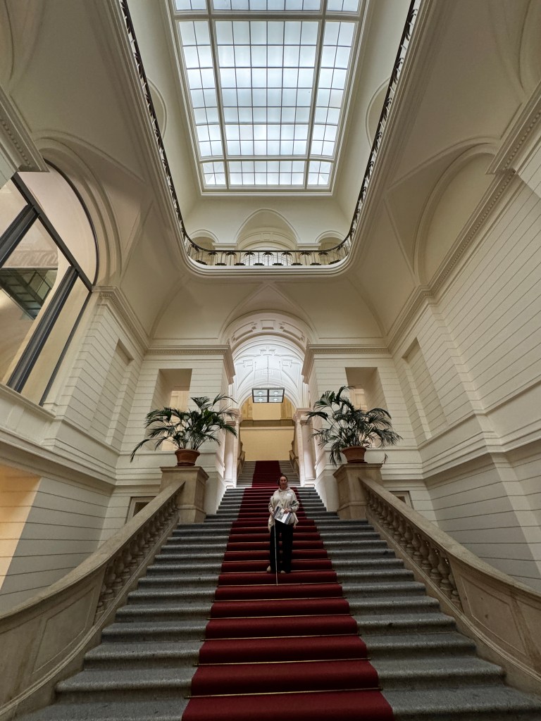 Die Wandelhalle hat drei Bereiche: Studieren, Speisen und Diskutieren. Auf der Westseite ist die Bibliothek, auf der Ostseite das Casino, und in der Mitte geht der Weg zum Plenarsaal. Hier in der Parlamentslobby treffen sich die Abgeordneten während der Sitzung, um mit Bürgern, Parlamentariern und Interessensvertretern zu diskutieren.
