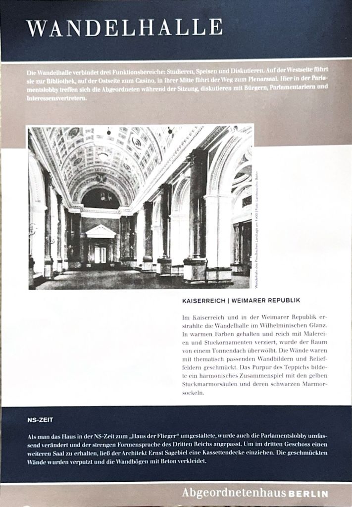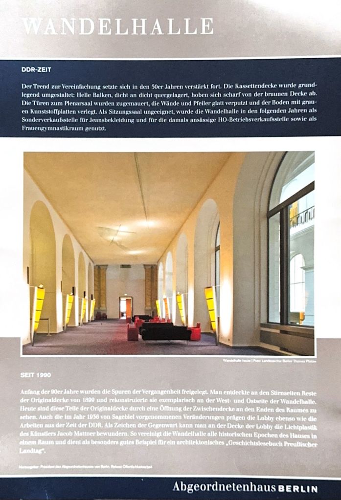 Heute sind diese Teile der Originaldecke durch eine Öffnung der Zwischendecke an den Enden des Raumes zu sehen. Auch die im Jahr 1956 von Sagebiel vorgenommenen Veränderungen prägen die Lobby ebenso wie die Arbeiten aus der Zeit der DDR. Als Zeichen der Gegenwärt kann man an der Decke der Lobby die Lichtplastik des Künstlers Jacob Matiner bewundern. So verelnigt die Wandelhalle alle historischen Spochen des Hauses in einem Raum und dient als besonders gutes Beispiel für ein architektonisches „Geschichtslesebuch Preußischer Landtag.
